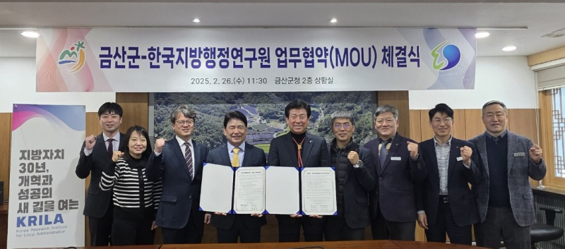 한국지방행정연구원(원장 육동일)과 금산군(군수 박범인)은 지난 26일 금산군 지방행정 경쟁력 강화 및 지역발전 지원을 위한 업무협약을 체결했다.