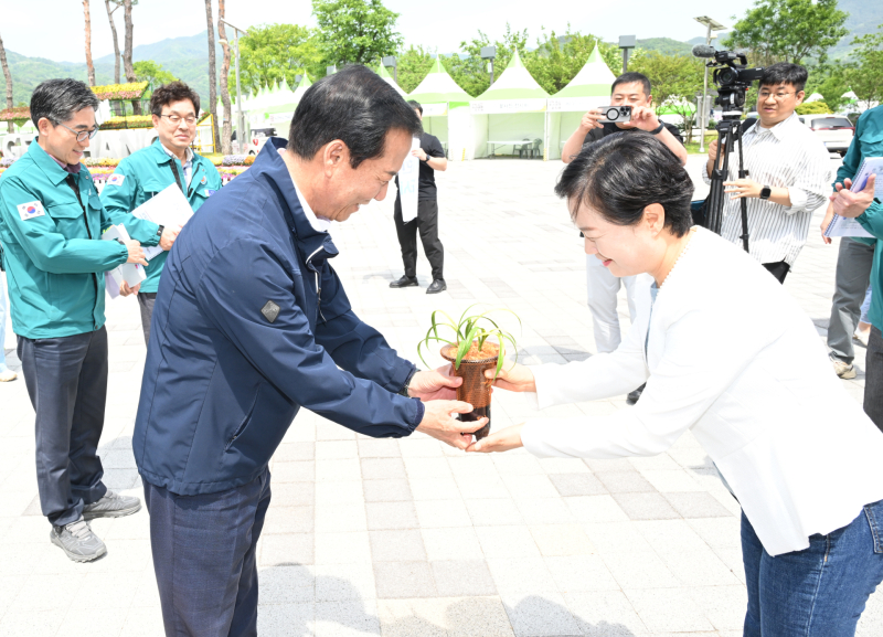 ▲경남 제1호 지방정원으로 국가정원 등록을 추진 중인 '거창 창포원'에서 화분 전달식이 진행됐다. [거창군청]