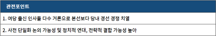 일각에서는 사전 단일화 논의 가능성도 거론되고 있으며, 정치적 연대와 전략적 결합이 주요 관전 포인트가 될 것으로 보인다.