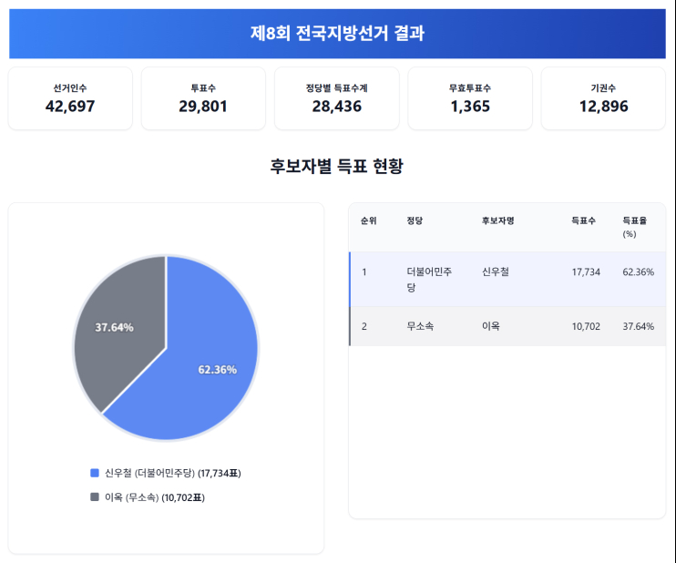 2022년 제8회 전국지방선거에 따르면, 더불어민주당 신우철 완도군수가 득표수 17,734표를 얻었으며. 62.36%로 당선됐다.무소속 이옥 후보는 10,702표로 득표율 37.64%를 기록했다.
