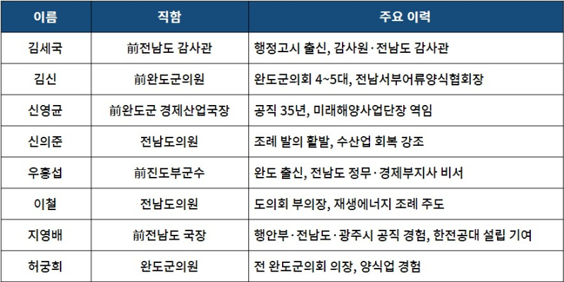 ▲김세국 전 전남도 감사관 ▲김신 전 완도군의원 ▲신영균 전 완도군 경제산업국장 ▲신의준 전남도의원 ▲우홍섭 전 진도부군수 ▲이철 전남도의원 ▲지영배 전 전남도 국장 ▲허궁희 완도군의원(가나다 순) 등이다.