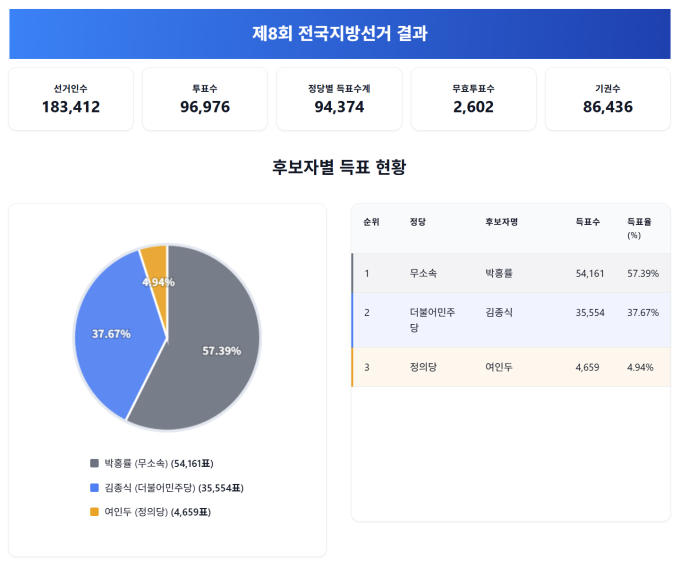 더불어민주당 김종식 후보는 35,554표로 37.67% 득표율을 기록했다.
