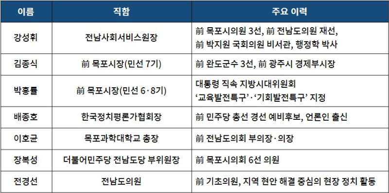 현재 출마가 거론되는 주요 인물은 ▲강성휘 전남사회서비스원장 ▲김종식 전 목포시장 ▲박홍률 전 목포시장 ▲배종호 한국정치평론가협회장 ▲이호균 목포과학대학교 총장 ▲장복성 더불어민주당 전남도당 부위원장 ▲전경선 전남도의원(가나다 순)이며, 각자 강점을 내세운 행보를 이어가고 있다.