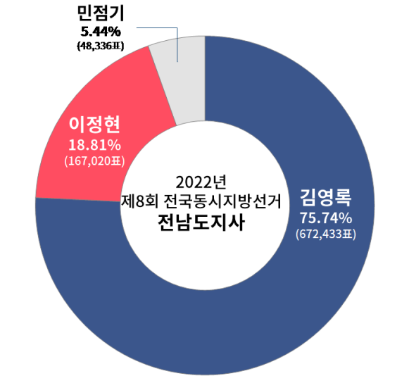 2022년 제8회 전국동시지방선거 전라남도지사 선거에서 더불어민주당 김영록 후보가 67만 2,433표(득표율 75.74%)를 얻어 당선됐다.