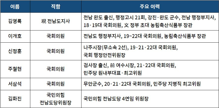 현재까지 △김영록 현 전남도지사 △이개호 국회의원 △신정훈 국회의원 △주철현 국회의원 △서삼석 국회의원 △김화진 국민의힘 전남도당위원장 등이 주요 출마 예정자로 거론되고 있다.