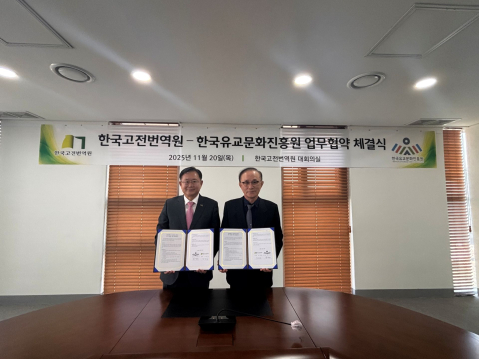 한국유교문화진흥원(원장 정재근)과 한국고전번역원(원장 김언종)은 11월 20일(목) 한국고전번역원 대회의실에서 업무협약(MOU)를 체결하며 전통문화 진흥을 위한 긴밀한 협력체계를 마련했다. 이번 협약은 유교 전통문화와 고전 인문자원이 현대적 활용과 혁산을 위해 양 기관이 힘을 모으는 출발점이라는 점에서 의미가 크다.