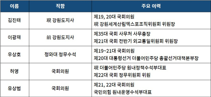 ▲우상호 (청와대 정무수석) 우상호 전 의원은 중앙 정치 상징성이 강한 인물이다. 원주 기반과 당내 인지도, 전략가 이미지가 강점이지만, 현재는 관망 모드에 가깝다. 여론조사에서 김진태와의 단순 양자 대결에서는 우위를 보이는 경우도 있었으나, 민주당 내부 경쟁 구도로 들어가면 이광재에게 밀리는 구조가 반복된다. 즉, “본선용 카드”로는 매력적이지만 경선 통과 가능성이 불확실하다.