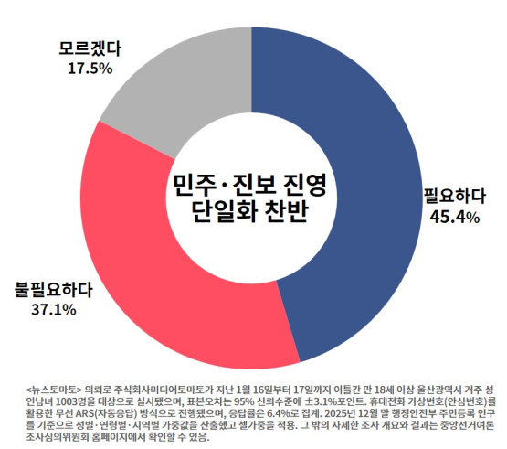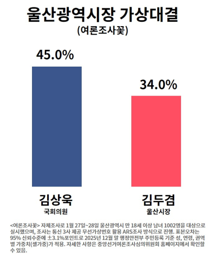 ※<여론조사꽃> 자체조사로 1월 27일~28일 울산광역시 만 18세 이상 남녀 1002명을 대상으로 실시했으며, 조사는 통신 3사 제공 무선가상번호 활용 ARS조사 방식으로 진행. 표본오차는 95% 신뢰수준에 ±3.1%포인트로 2025년 12월 말 행정안전부 주민등록기준 성, 연령, 권역별 가중치(셀가중)가 적용. 자세한 사항은 중앙선거여론조사심의위원회 홈페이지에서 확인할 수 있음.