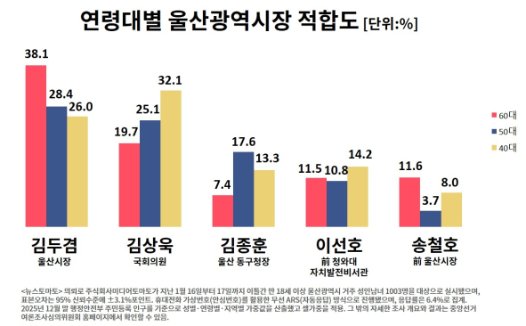연령대별 울산시장 적합도 여론조사를 살펴 봤을 때도 산업·노동 인구 비중이 높은 지역의 특성상, 40·50대를 중심으로 한 중장년층 유권자들이 정권 평가와 생활경제 이슈에 민감할 수 밖에 없고, 이 여론이 40대 젊은 김상욱 의원의 지지로 이어질 경우, 판세가 달라질 여지가 있다.
