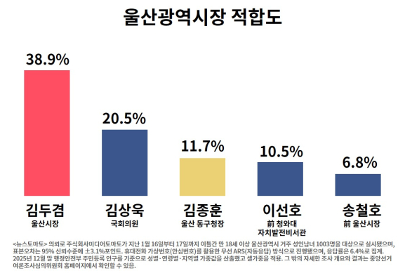 ※<뉴스토마토> 의뢰로 주식회사미디어토마토가 지난 1월 16일부터 17일까지 이틀간 만 18세 이상 울산광역시 거주 성인남녀 1003명을 대상으로 실시됐으며, 표본오차는 95% 신뢰수준에 ±3.1%포인트. 휴대전화 가상번호(안심번호)를 활용한 무선 ARS(자동응답) 방식으로 진행됐으며, 응답률은 6.4%로 집계. 2025년 12월 말 행정안전부 주민등록 인구를 기준으로 성별·연령별·지역별 가중값을 산출했고 셀가중을 적용. 그 밖의 자세한 조사 개요와 결과는 중앙선거여론조사심의위원회 홈페이지에서 확인할 수 있음.