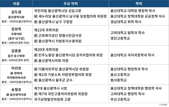 여론조사 결과를 구체적으로 보면 김두겸 시장에 이어, 더불어민주당 김상욱 의원(울산 남구갑)이 20%대 초반으로 추격하고 있다. 그 뒤를 진보당 김종훈 현 울산 동구청장, 더불어민주당 이선호 전 청와대 자치발전비서관, 더불어민주당 송철호 전 울산시장이 뒤를 잇는 양상이다.