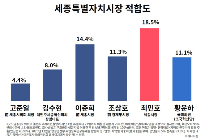 지난 1월 26일부터 27일까지 ‘굿모닝충청’이 여론조사 전문기관 ㈜윈지코리아컨설팅에 의뢰해 실시한 세종시장 적합도 조사에서 최민호 세종시장은 18.5%로 1위를 기록했다. 이어 이춘희 전 세종시장 14.4%, 조상호 전 경제부시장 11.3%, 황운하 국회의원 11.1%, 김수현 더민주세종혁신회의 상임대표 8.0%, 고준일 전 세종시의회 의장 4.4% 순으로 나타났다.