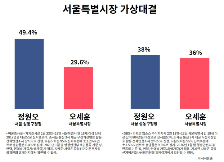여론조사기관 ‘여론조사꽃’이 2월 23~25일 실시한 가상 양자 대결 조사에서는 정원오 성동구청장이 49.4%, 오세훈 서울시장이 29.6%로 나타났다. 정 구청장이 오차범위 밖에서 앞섰다는 결과다. 반면 SBS 의뢰로 입소스 주식회사가 2월 11~13일 실시한 조사에서는 오 시장 38%, 정 구청장 36%로 오차범위 내 접전 양상이 나타났다. 정치권에서는 “아직 본선 구도가 확정되지 않은 상황에서 정권 평가 변수와 후보 단일화 여부에 따라 판세가 크게 달라질 수 있다”는 분석이 나온다.