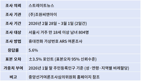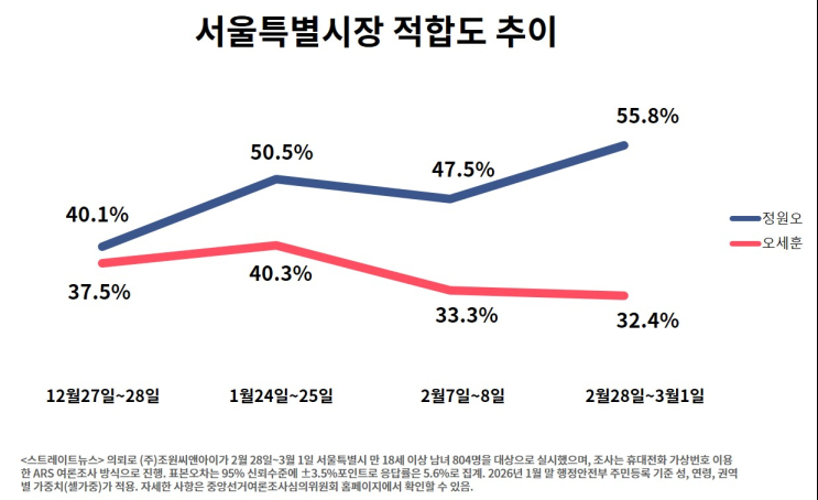 지지율 추이를 보면 지난해 말까지만 해도 오세훈 시장과 정원오 전 구청장의 지지율은 오차범위 내 접전을 보였다. 하지만 최근 조사에서는 정 전 구청장의 지지율이 크게 상승한 반면 오 시장의 지지율은 다소 하락하면서 격차가 벌어지는 모습이다.
