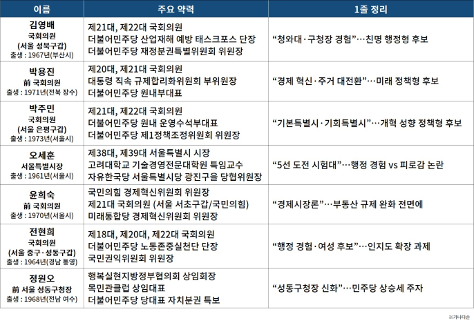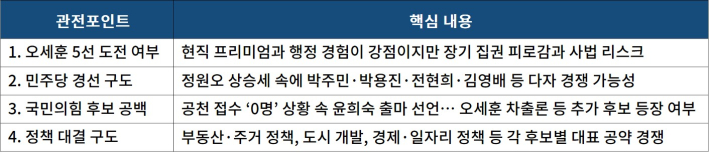 민주당은 정원오 전 성동구청장의 상승세 속에 다자 경선 구도가 형성되고 있고, 국민의힘은 오세훈 시장의 5선 도전 여부와 추가 후보 등장 여부가 변수로 꼽힌다.